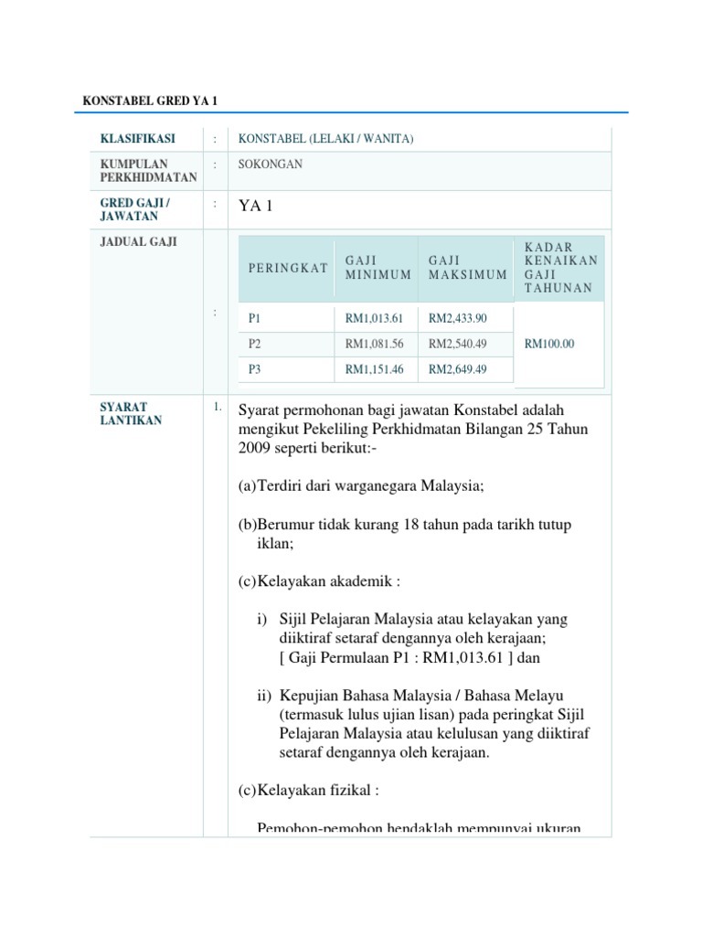 Deskripsi Tugas Gaji dan Syarat Kelayakan Konstabel Gred YT1 Berikut. YA1 JADUAL GAJI YA1. 2021514 Proses pengambilan calon konstabel polis bermula dengan.